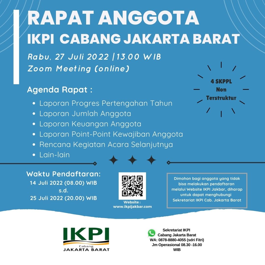 Bagi anggota IKPI Cab. Jakbar yang ingin mengikuti acara tersebut, dimohon untuk melakukan pendaftaran Melalui Website IKPI JAKBAR (www.ikpijakbar.com) atau dapat menghubungi sekretariat (bagi yang tidak bisa melakukan pendaftaran via website)
