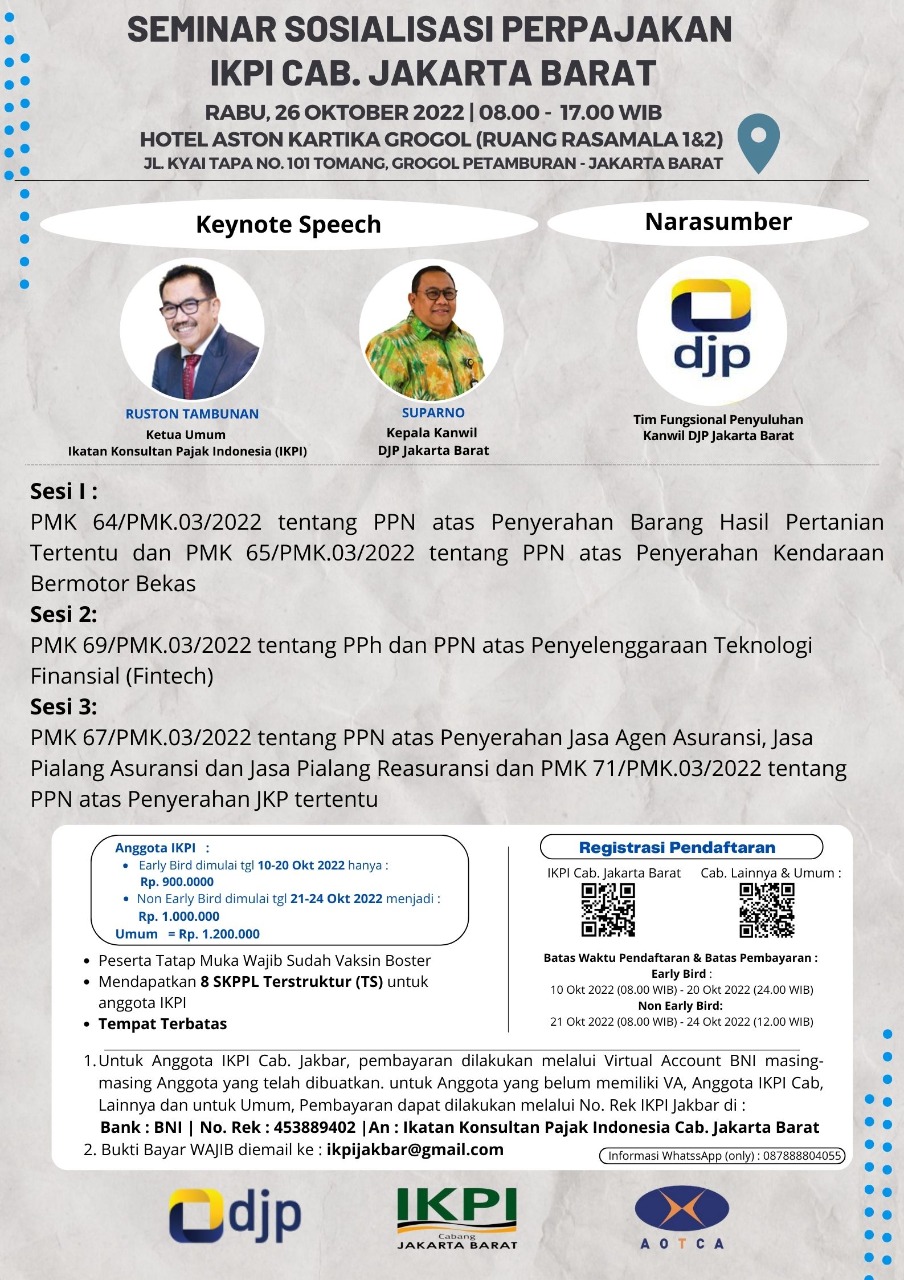 - Pendaftaran EARLY BIRD (Hanya Khusus Untuk Anggota IKPI) : Tgl 10 Oktober 2022 jam 08.00 WIB s/d 20 Oktober 2022 jam 24.00 WIB.
